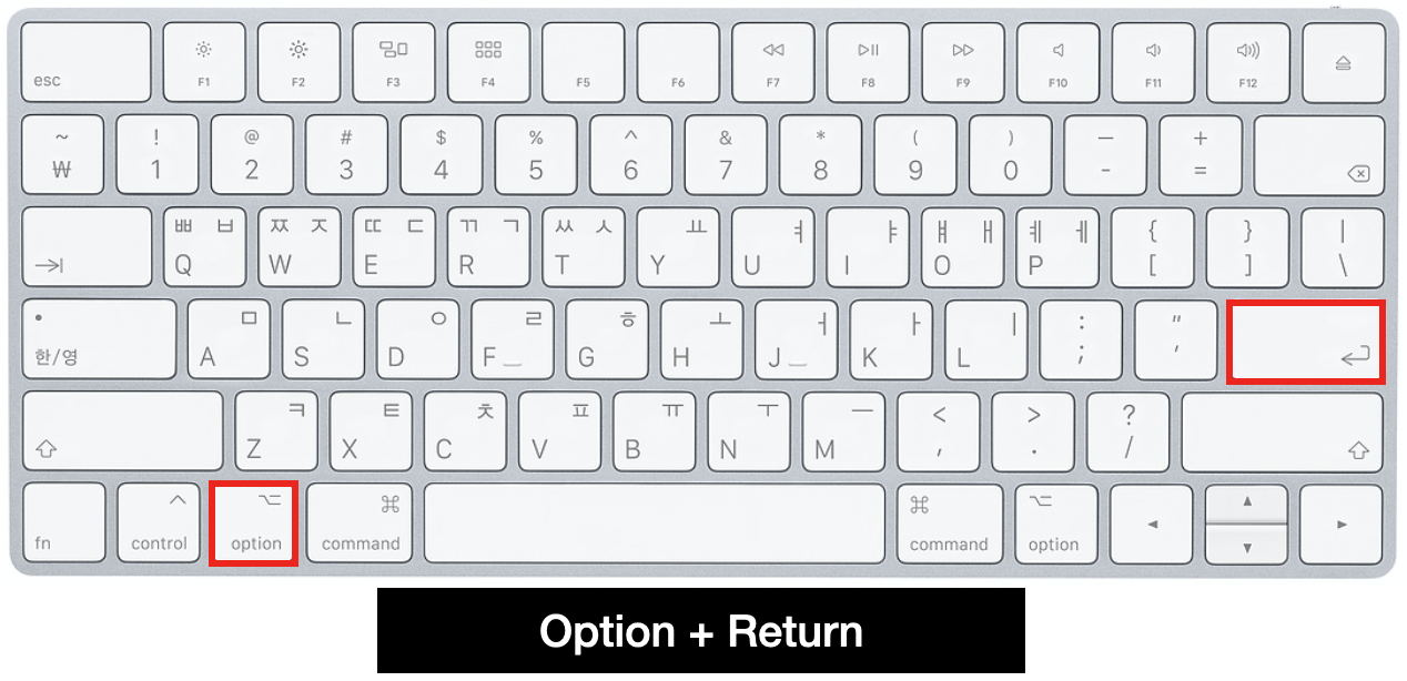 : Option을 누른 상태에서 Enter키를 칩니다.