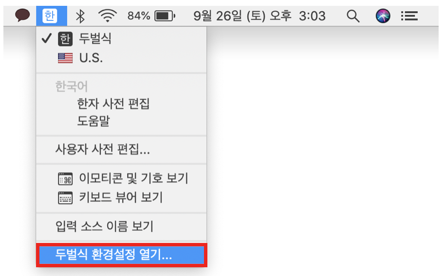 * "영어" 입력 상태였을 때는 아래와 같이 "키보드 환경설정 열기"를 클릭합니다.