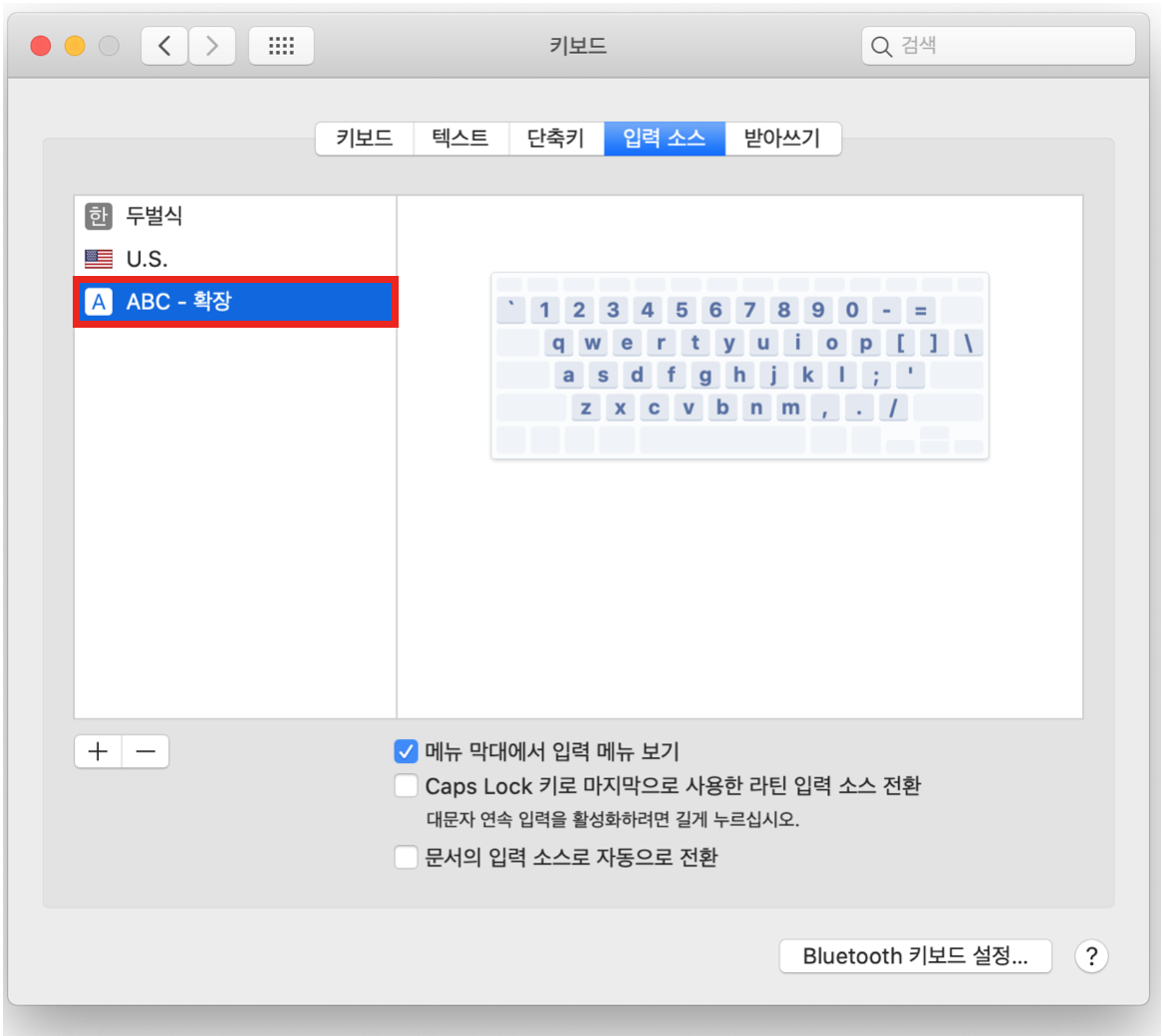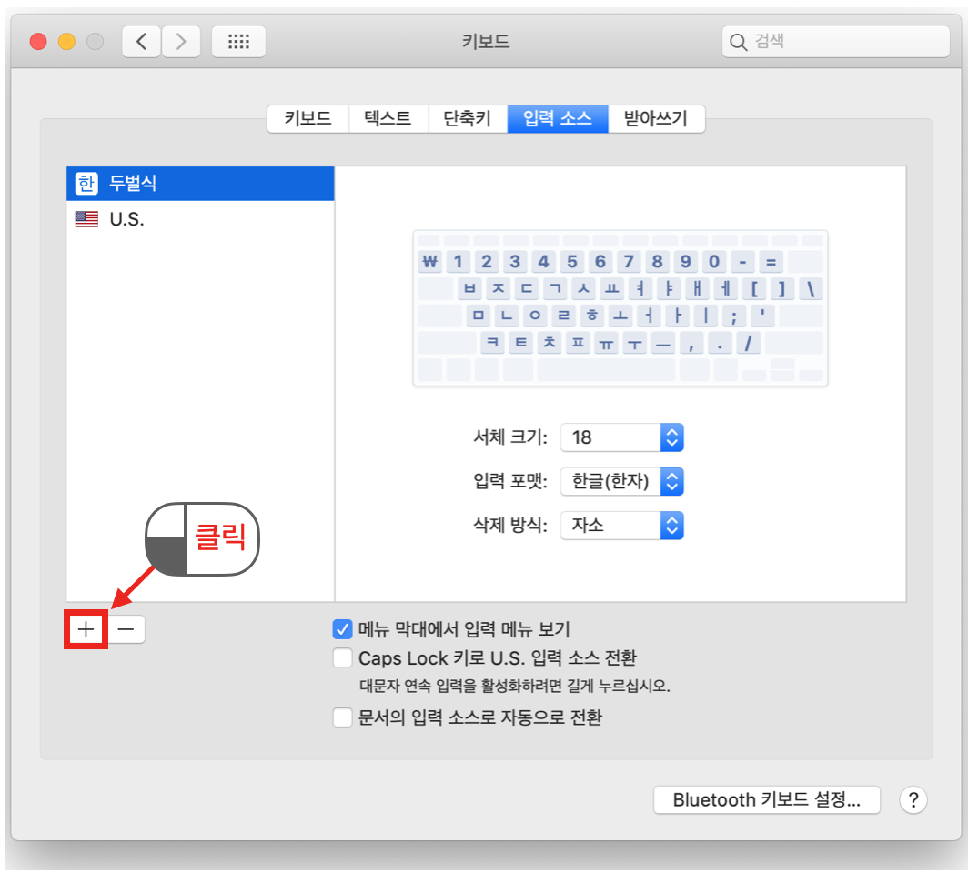 * 메뉴막대 좌상단의 "애플로고>시스템환경설정>키보드>입력소스" 경로로 진입해도 됩니다.
