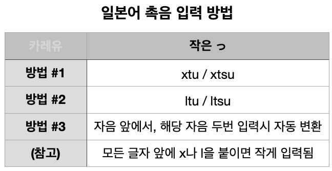 자음 앞에 촉음(っ) 입력시, 자음을 두번 입력해도 됩니다.