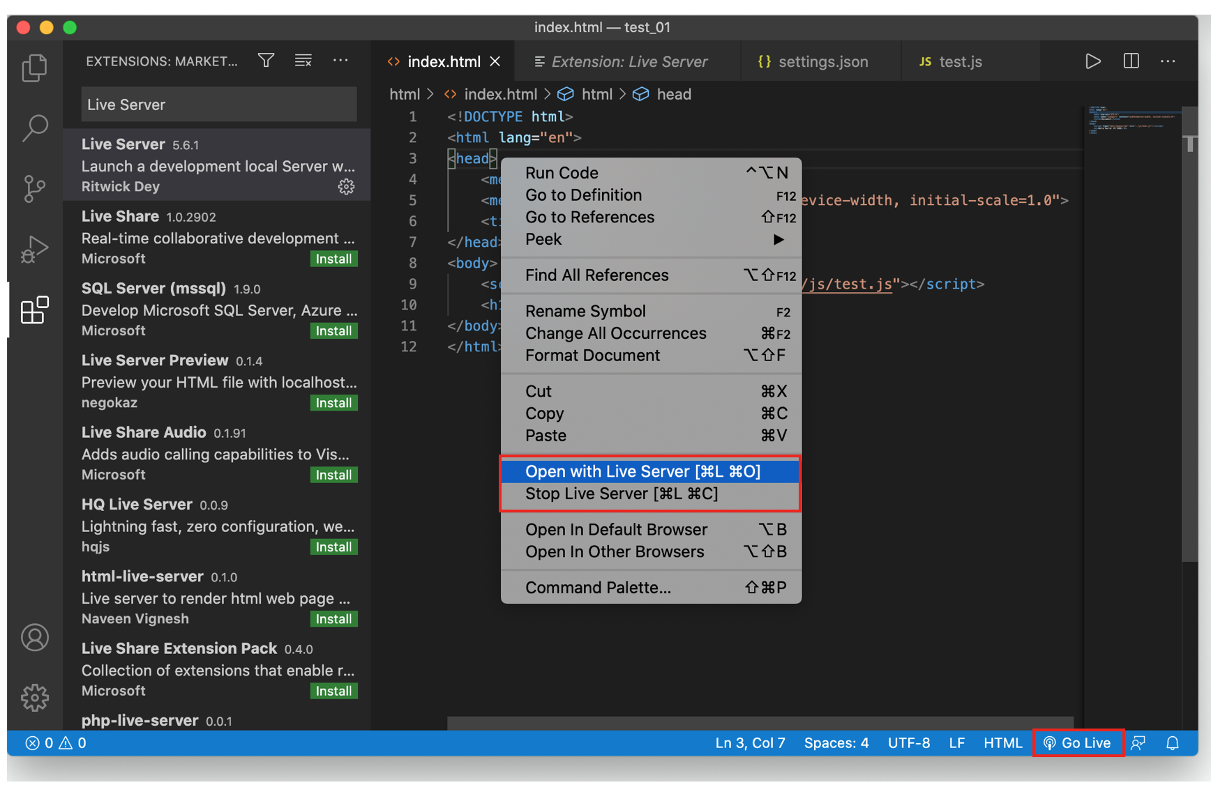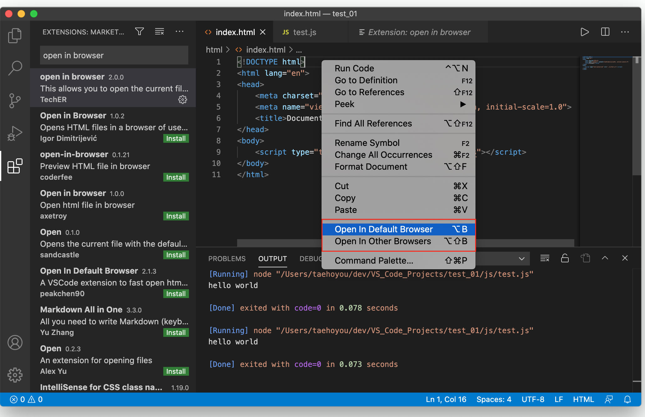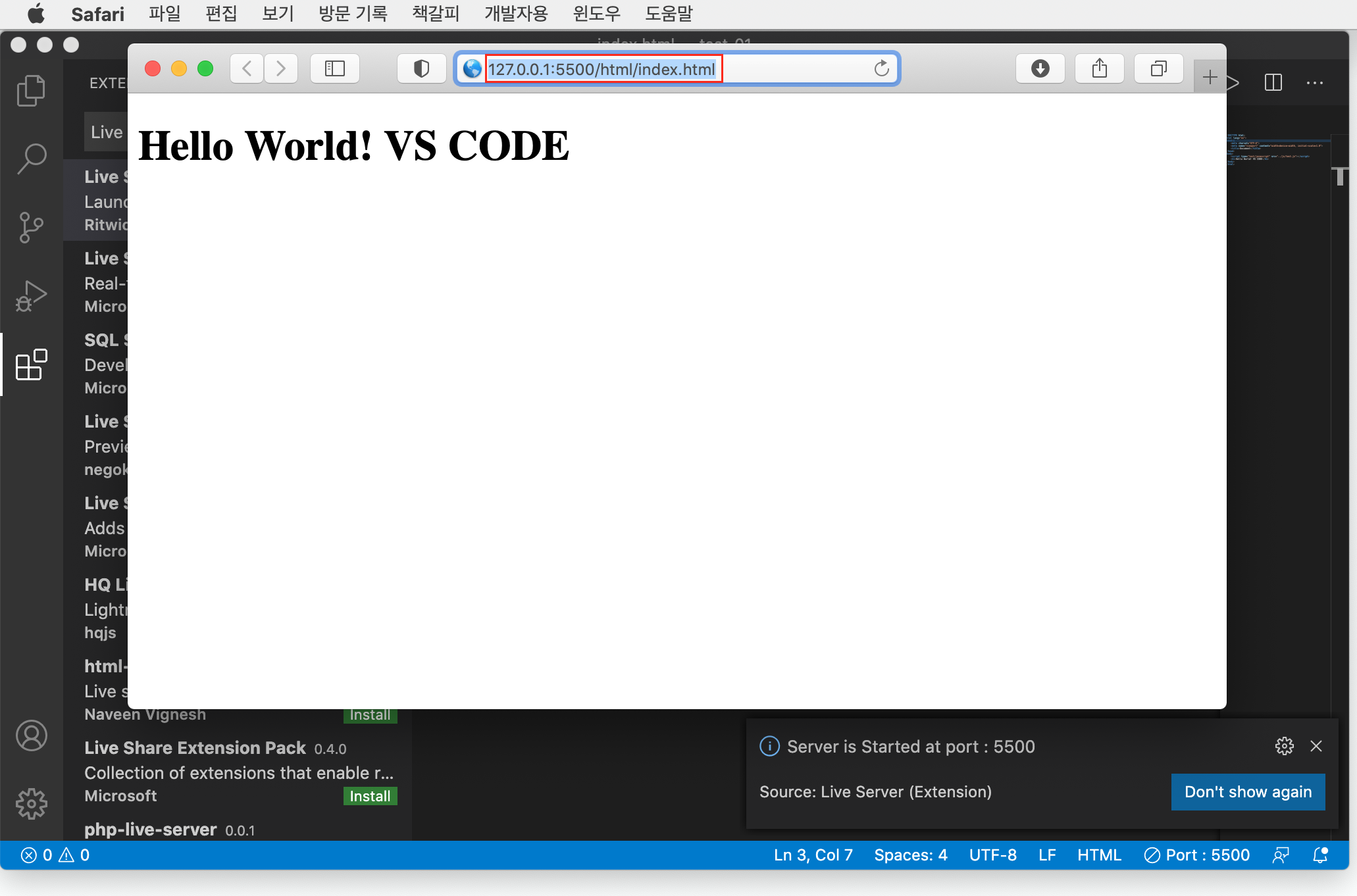 4. HTML 실행(open in browser, Live Server 활용)
