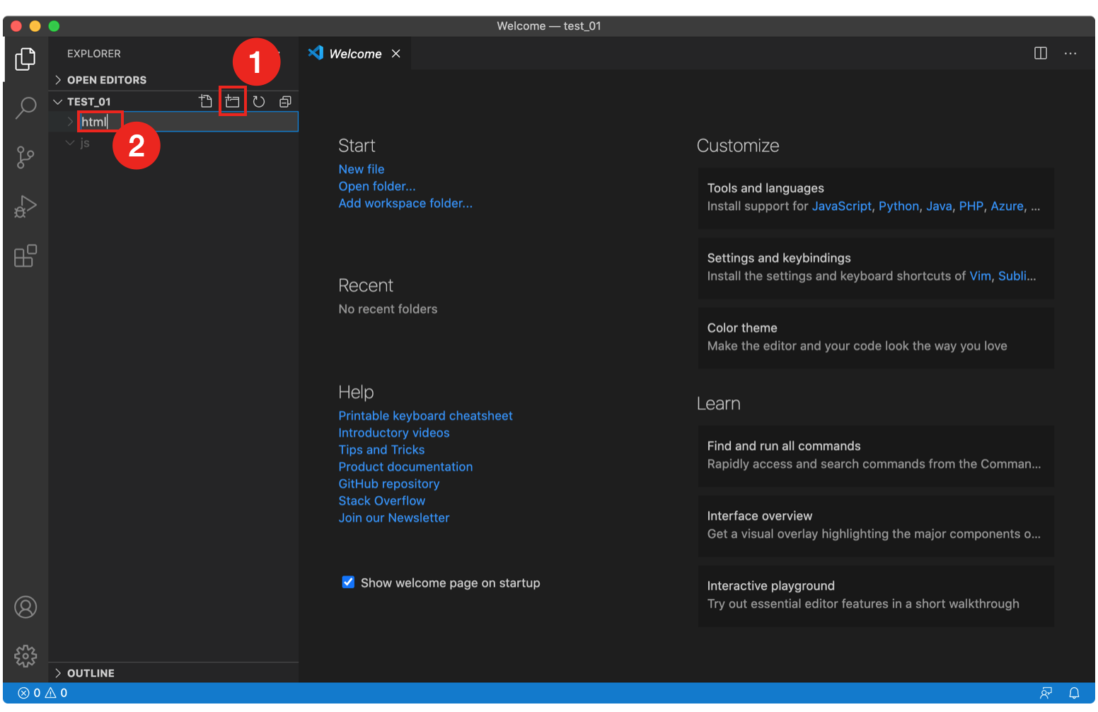 ▶︎ 두번째 아이콘을 클릭해 폴더를 만든다.(html, js 폴더를 만들었다)