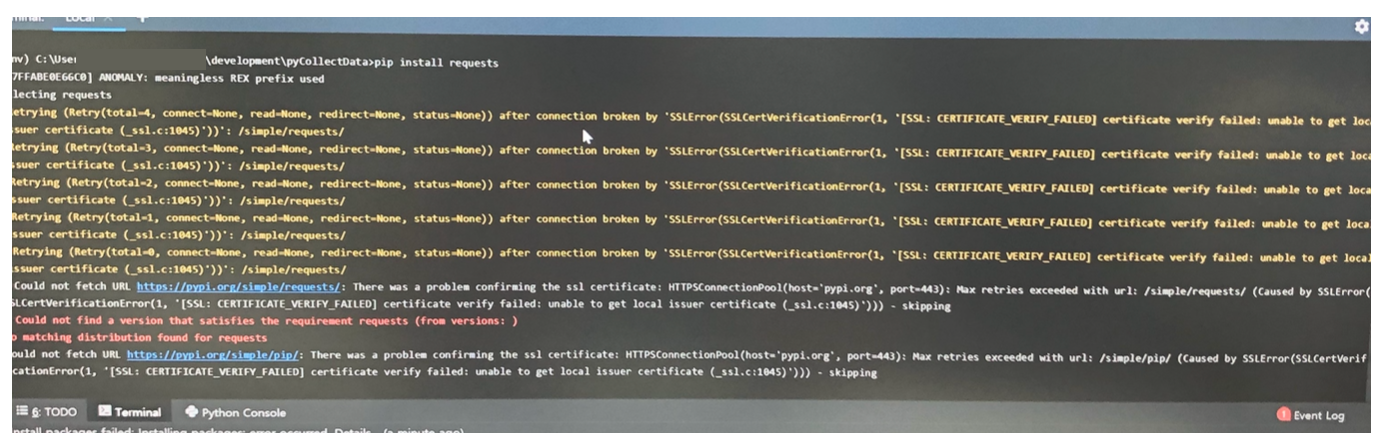 'SSLError(SSLCertVerificationError(1, '[SSL: CERTIFICATE_VERIFY_FAILED] certificate verify failed: unable to get local issuer certificate (_ssl.c:1045)'))'