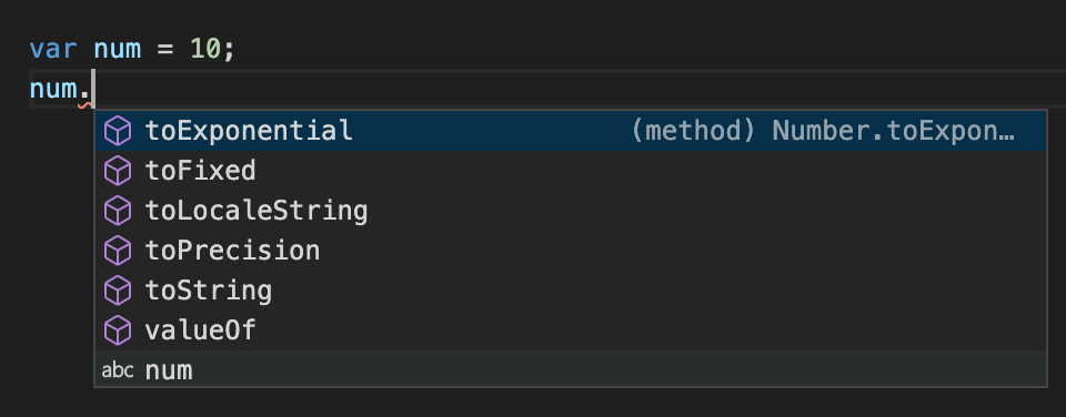 숫자, 문자열, 불리언, 심벌 타입 변수에 도트(.)를 찍었을 때의 자동완성 목록이다.