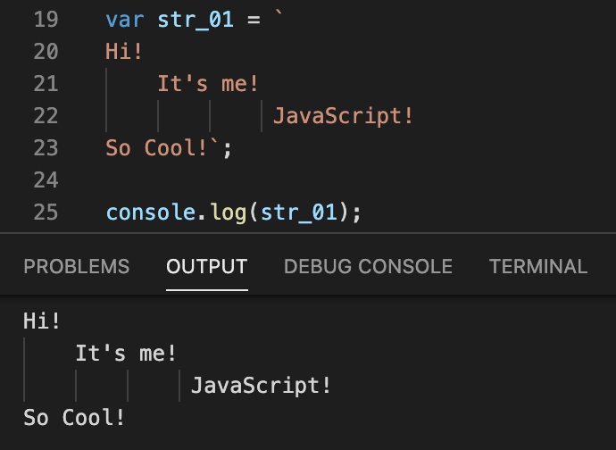 var str_01 = "Hi! \n\t It's me! \n\t\t\t JavaScript! \n So Cool!";