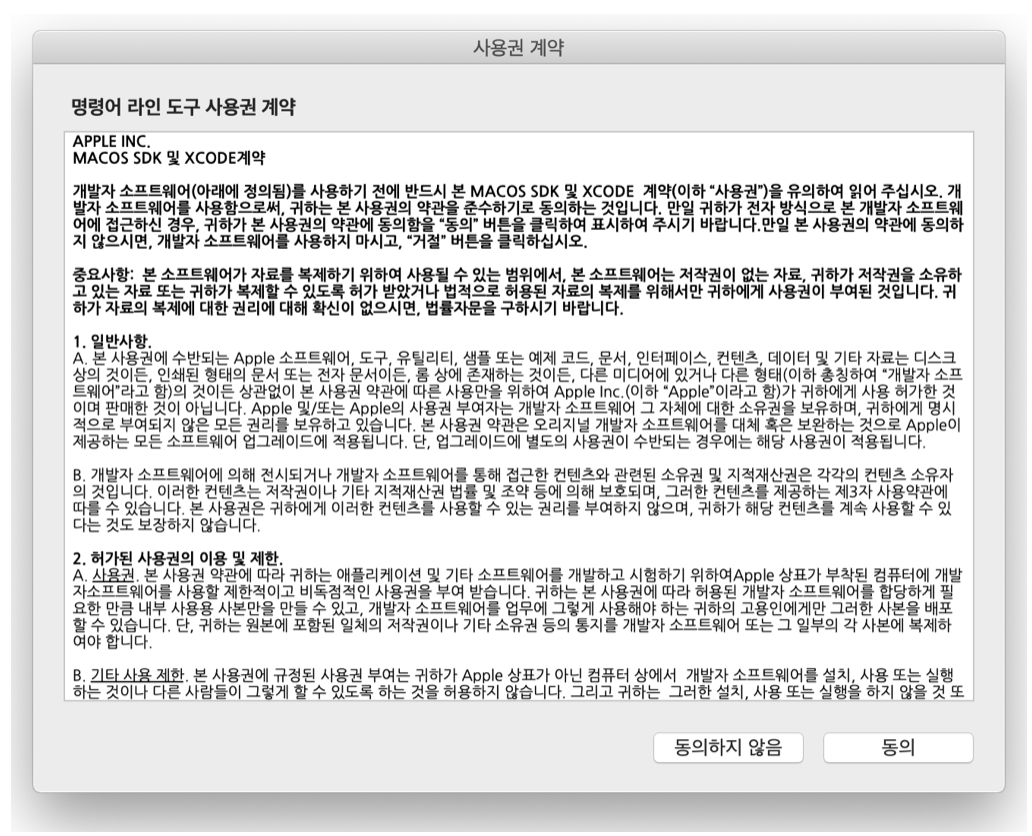 2. CLT(Command Line Tools)를 설치해준다. Xcode 없이도 터미널을 통해 각종 유틸리티를 이용할 수 있게 된다.