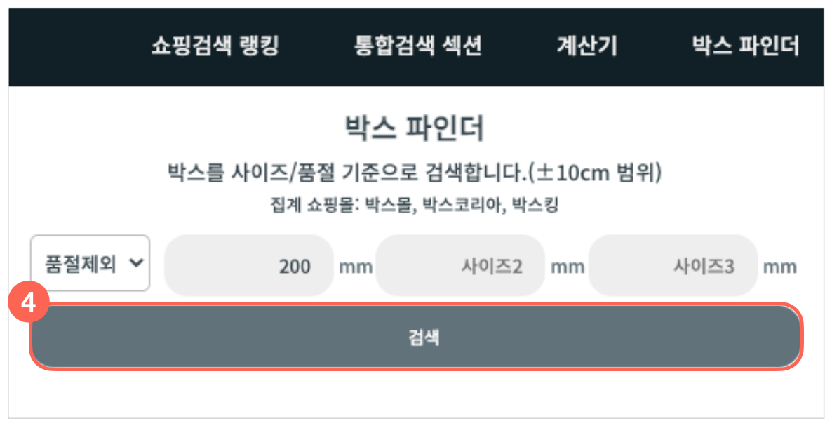 : 입력한 사이즈의 ±10cm 범위 내에 있는 택배 상자를 탐색합니다.