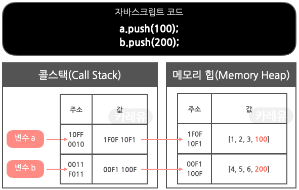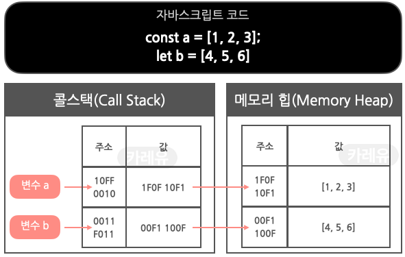 메모리 힙의 주소값은 콜 스택에 저장되고, a와 b에는 해당 콜스택의 주소값이 각각 저장된다.