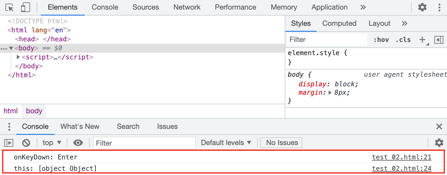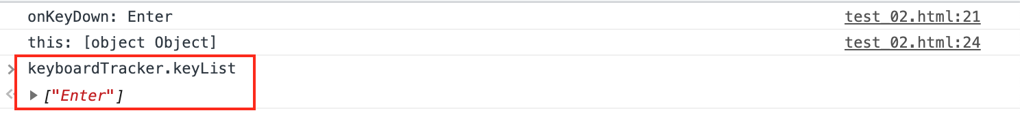 위 코드를 브라우저에서 실행한 후, 키보드에서 엔터키 등을 누르면 콘솔에 아래와 같이 출력된다.