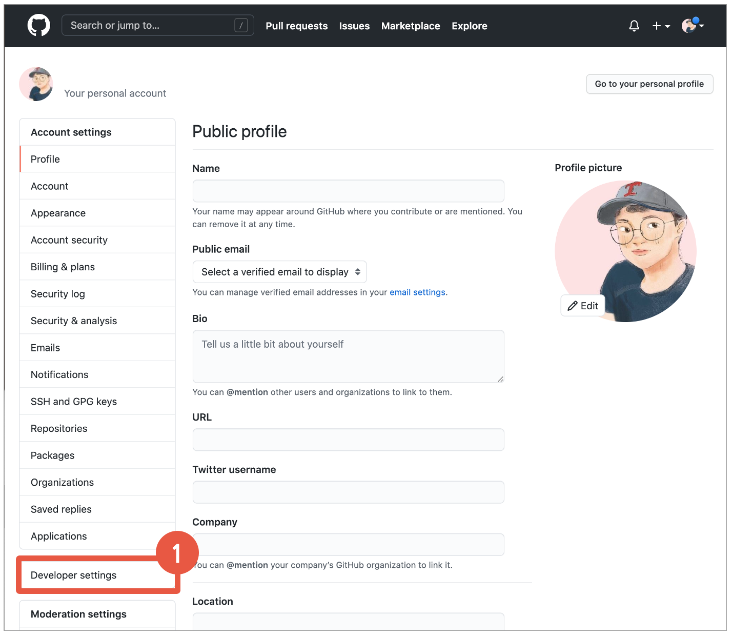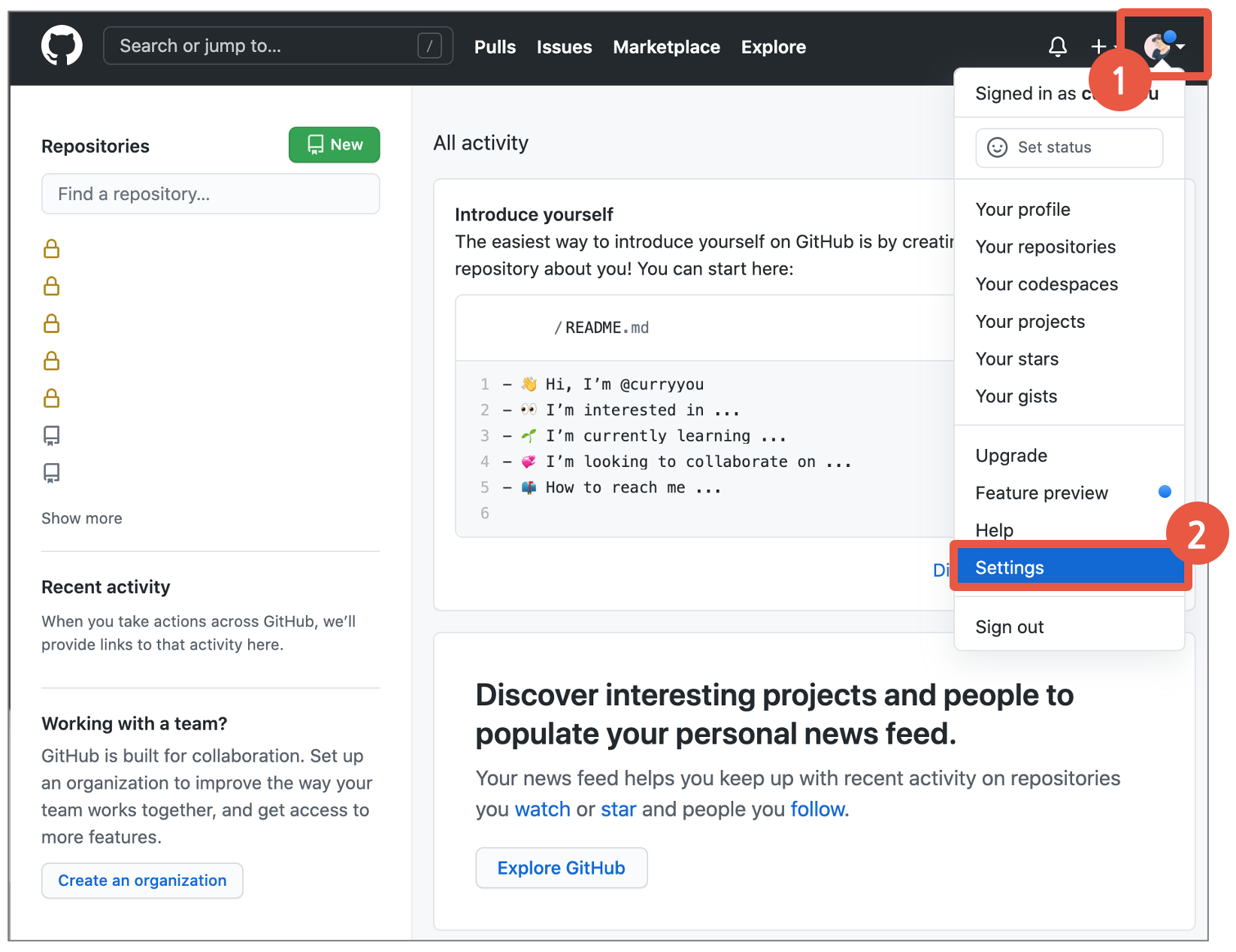 : 우상단의 Profile영역을 클릭후, Settings 접근