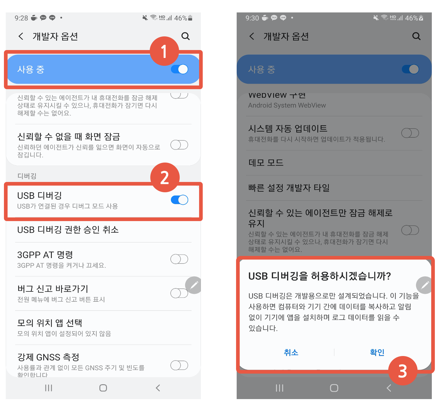 3) USB 디버깅 허용 팝업이 뜨면 "확인"을 눌러준다.