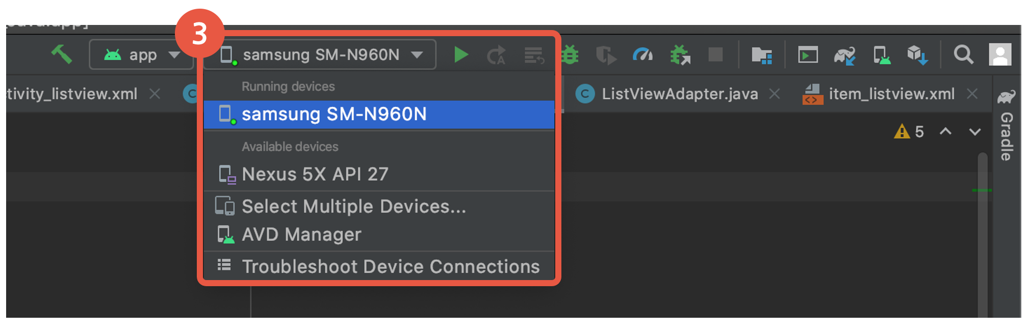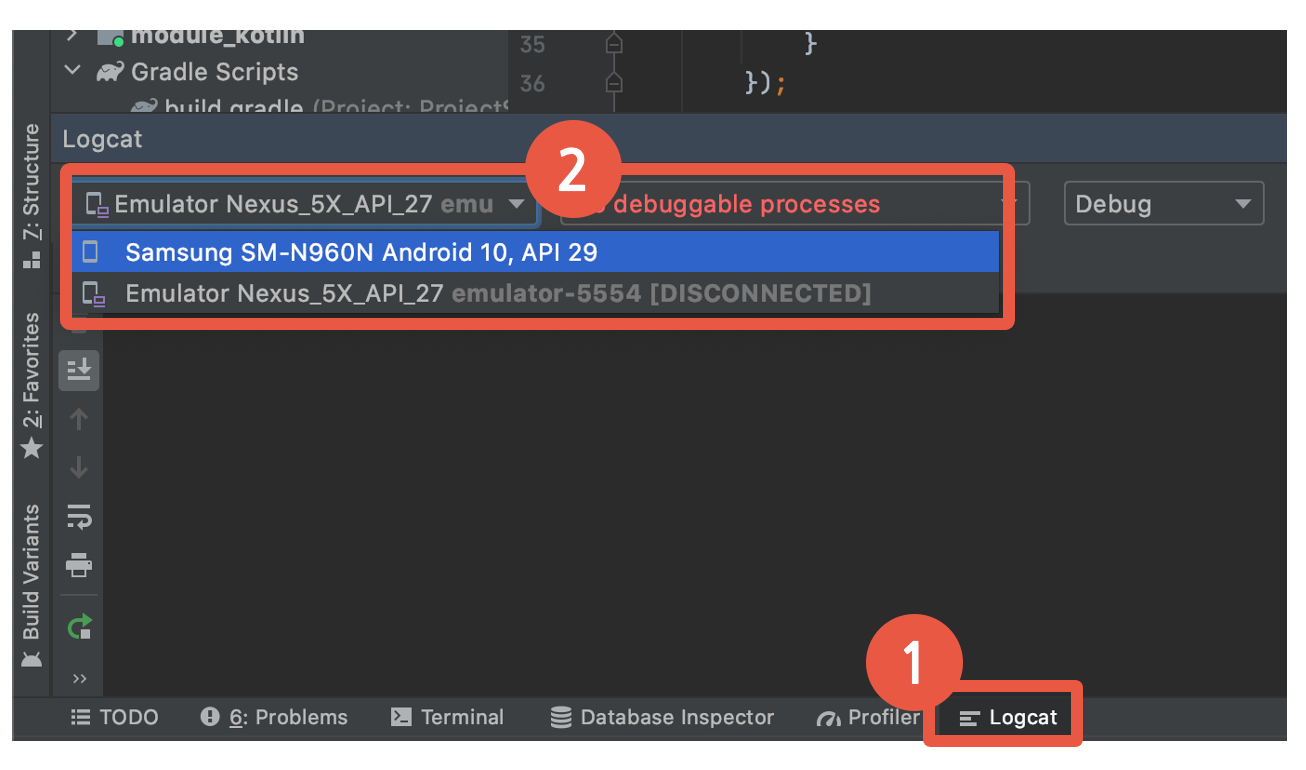 - 경우에 따라 알수 없는 기호가 나올 수 있는데, AVD에뮬레이터가 아닌 걸 선택해주면 된다.