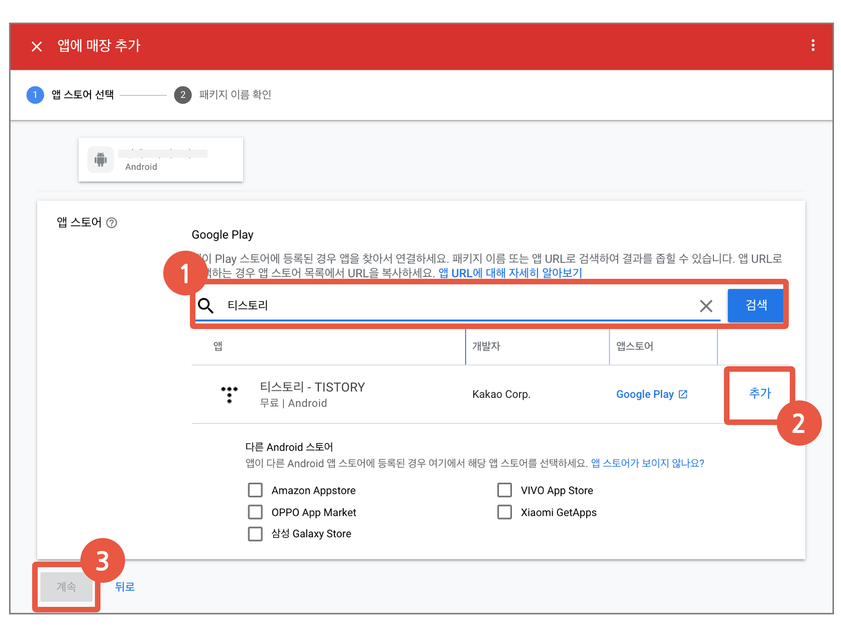 마찬가지로 앱 이름이나 패키지명 등으로 검색하여 등록하면 된다.