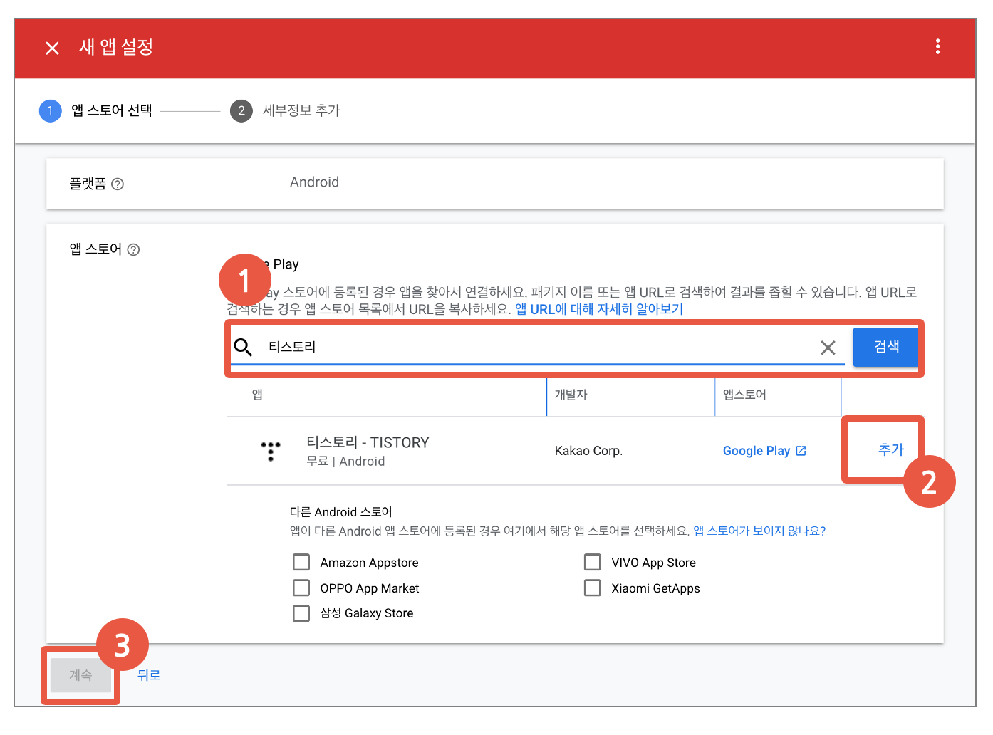 - 자신의 앱을 검색한 다음 "추가" 버튼을 누른 후 진행하면 된다. (예시를 위해 티스토리를 검색해봤다)