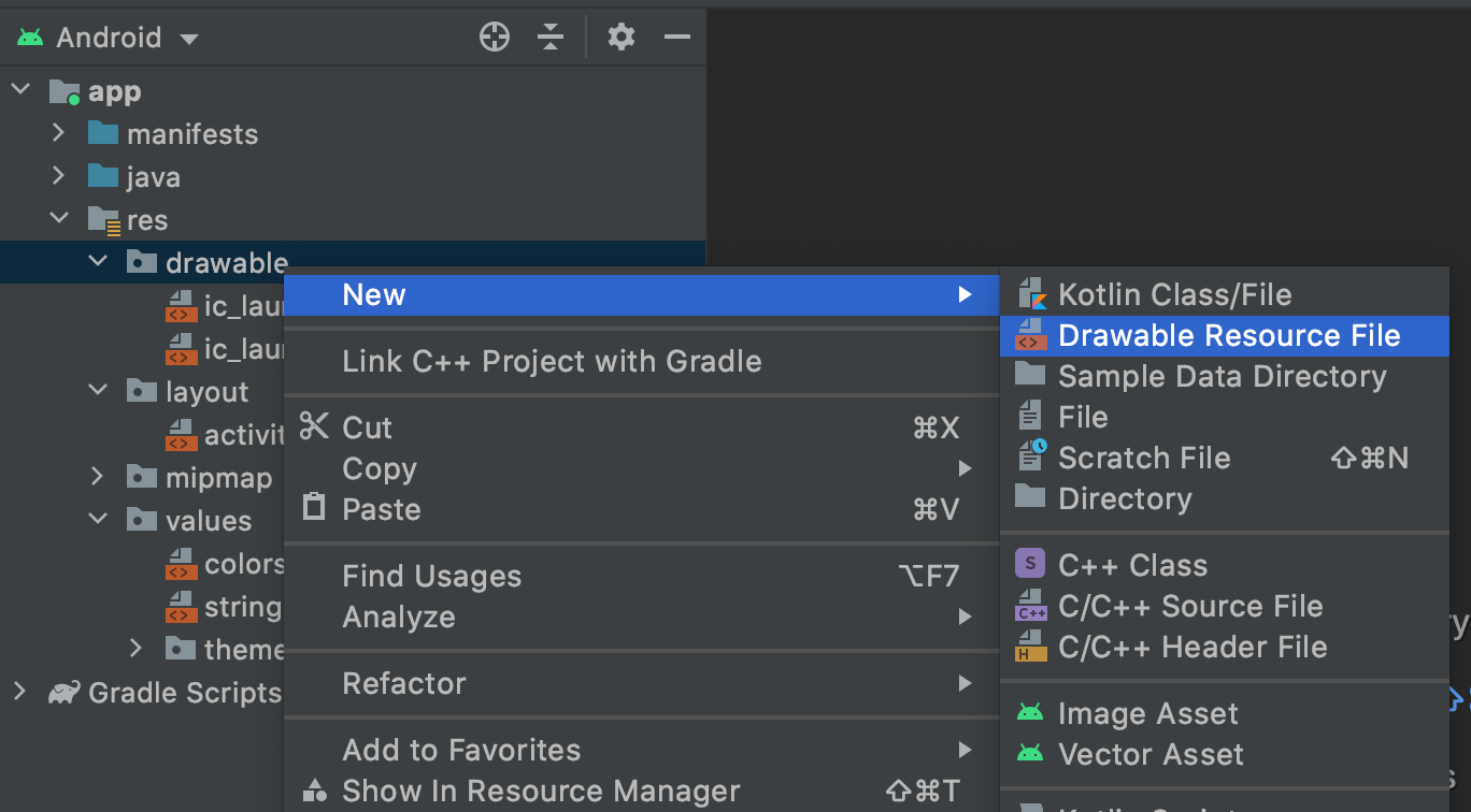 1. res > drawable 폴더에서 마우스 우클릭