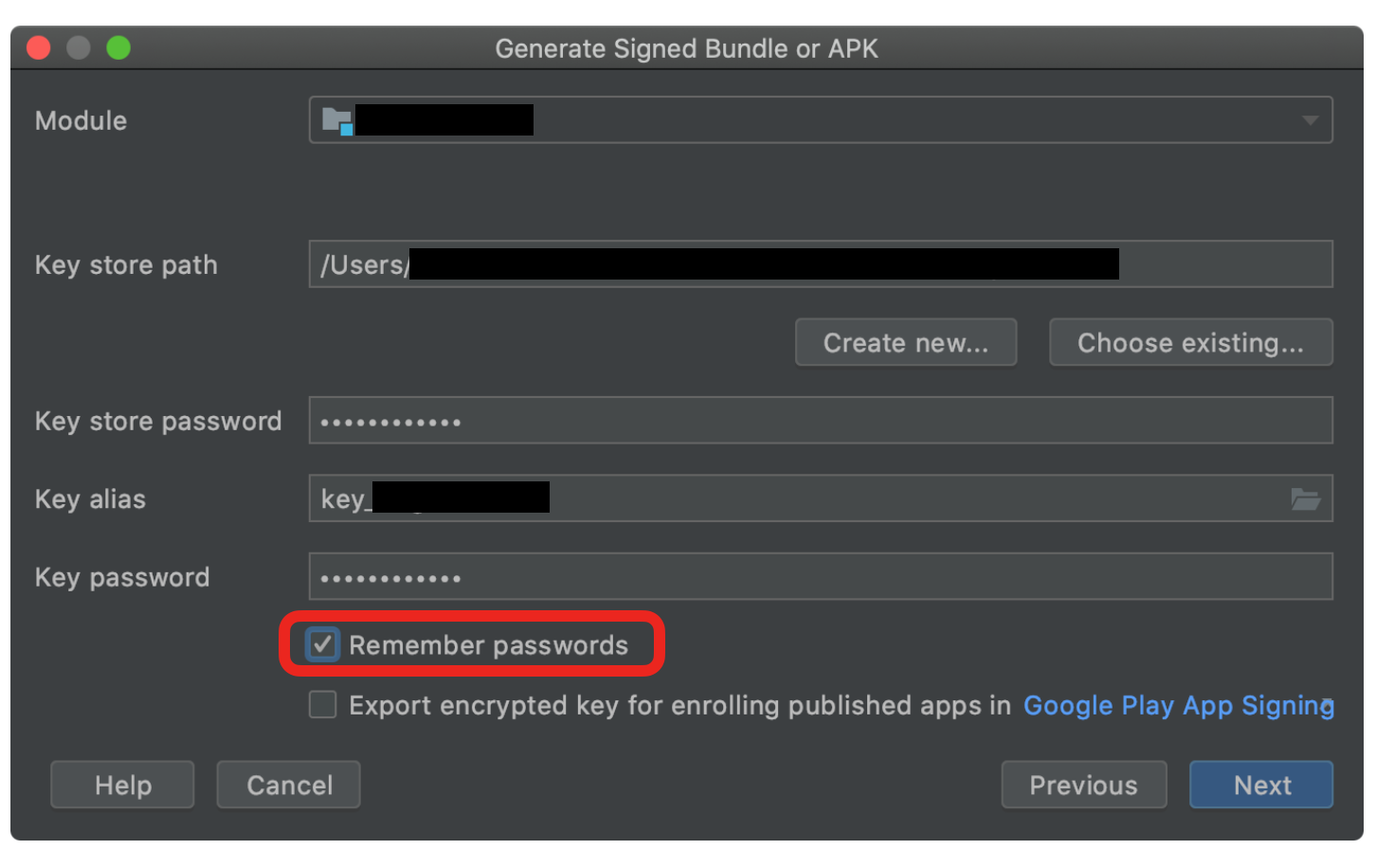Remember Password 항목을 체크 해제하고, 비밀번호를 직접 타이핑해서 입력하고 앱을 빌드하면 된다.