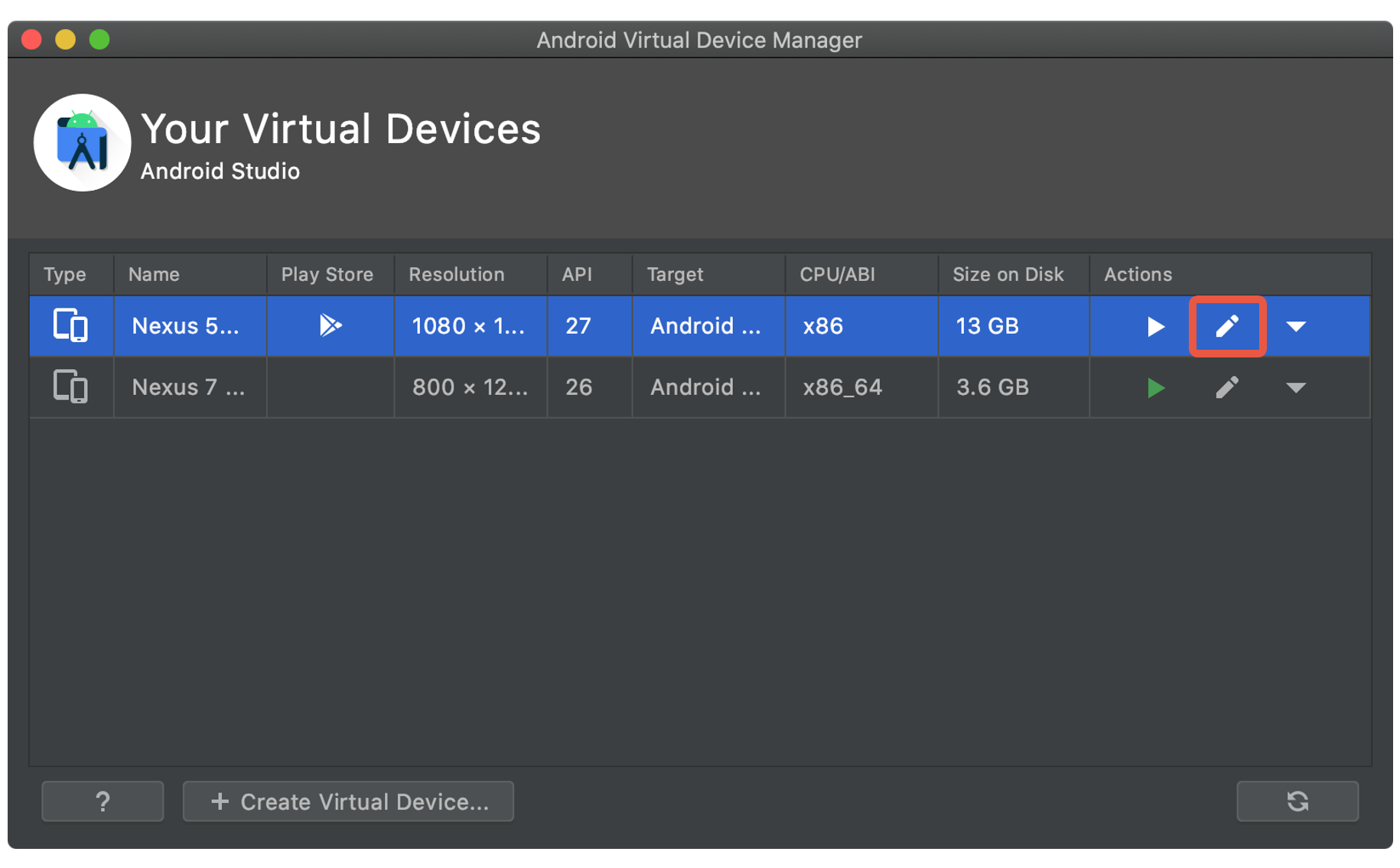 만약 기존 에뮬레이터를 수정하려면, AVD Manager에서 연필 모양의 수정 버튼을 눌러 진입하면 된다.