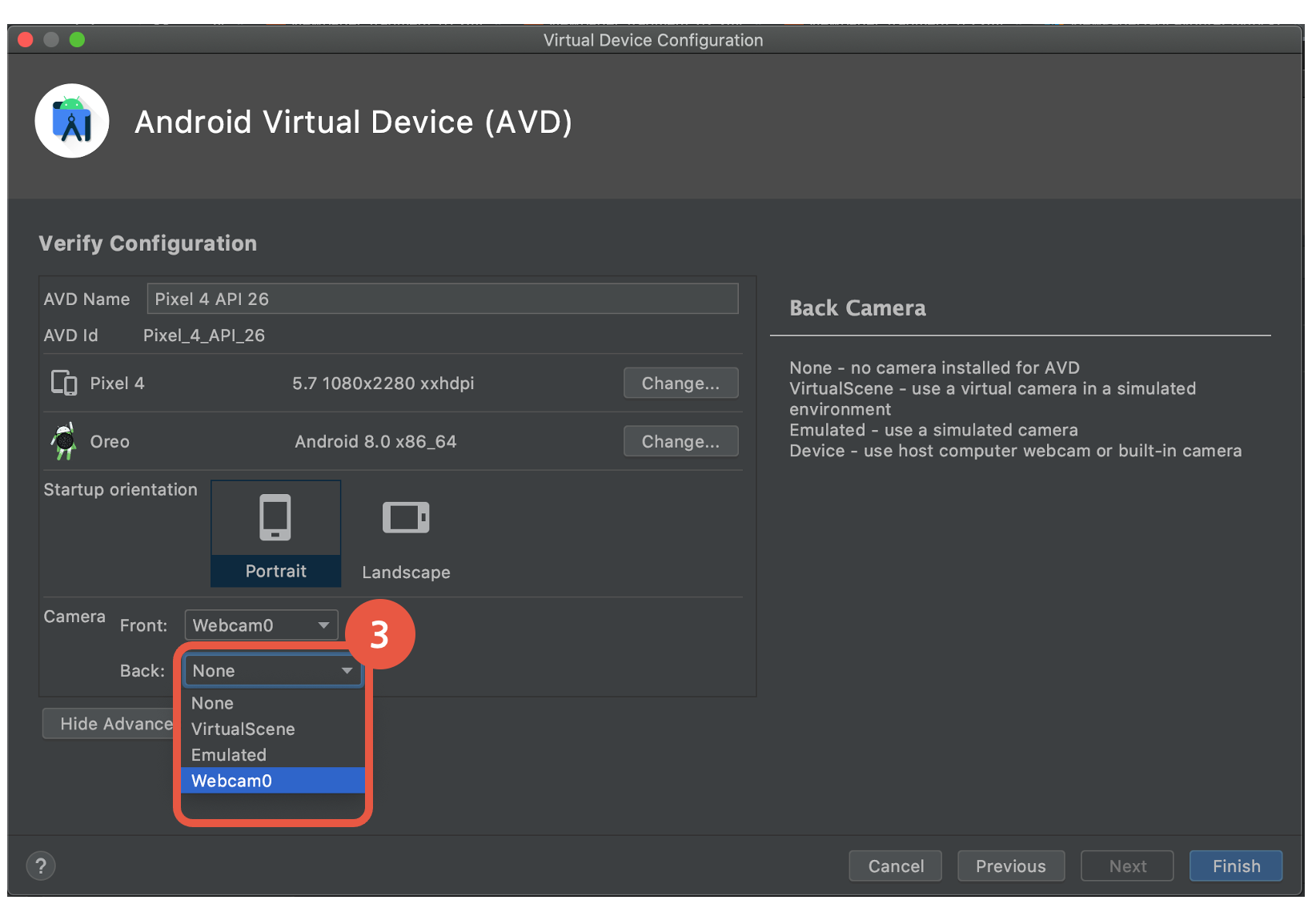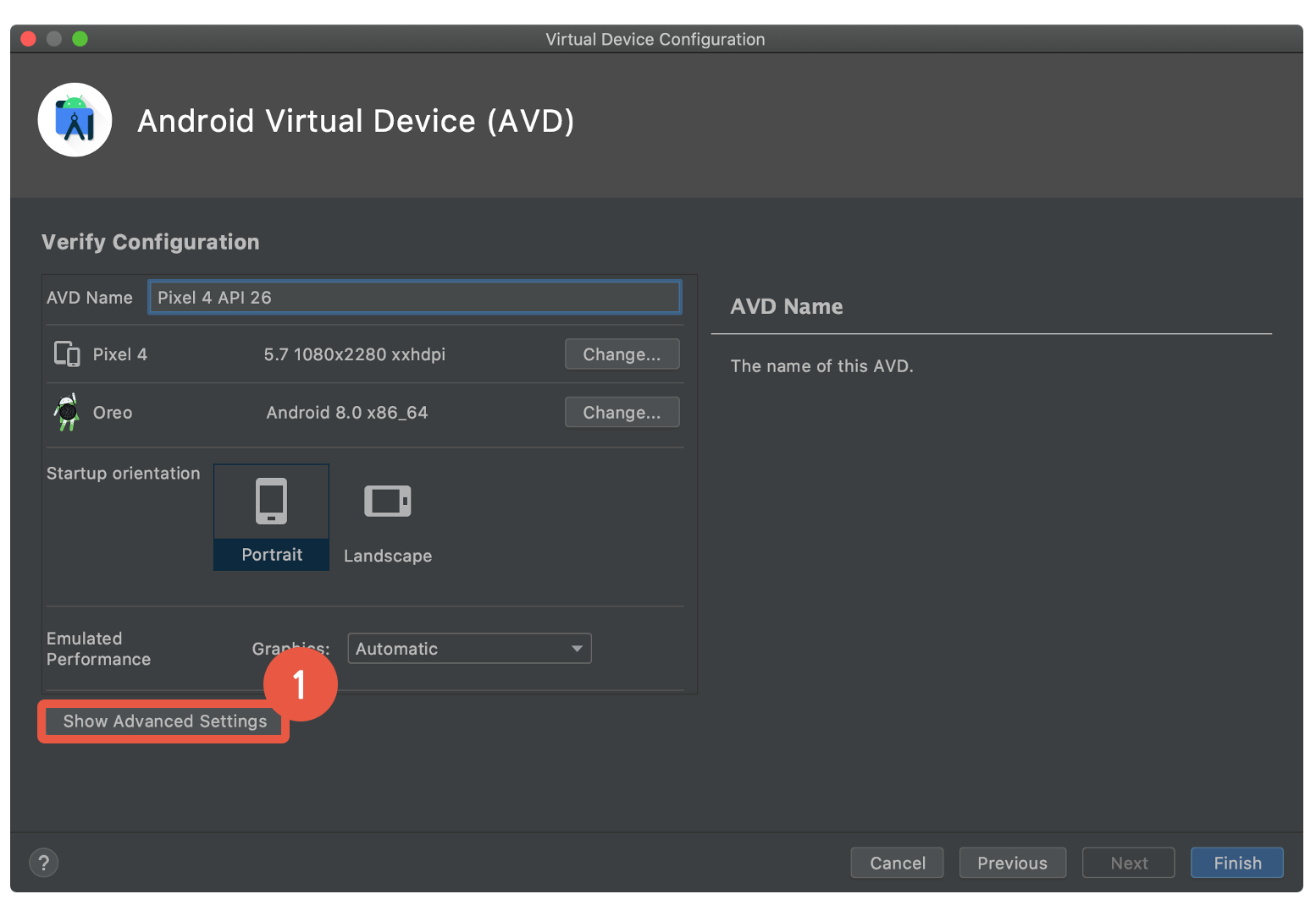 AVD Manager에서 에뮬레이터 생성 마지막 단계에서 다음 순서로 진행한다.