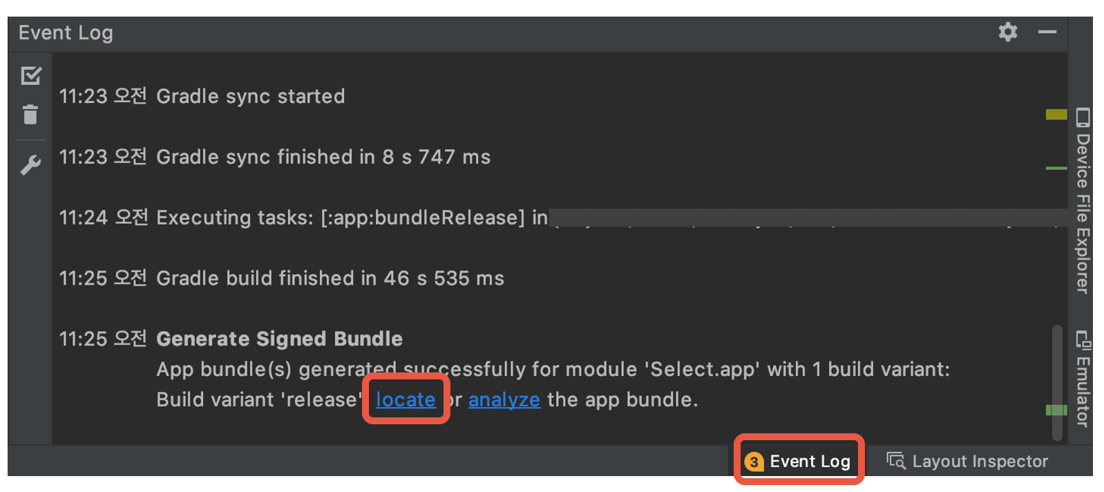 - 빌드 완료 후, Event Log 창에서 "locate"를 클릭하면 바로 해당 경로로 이동할 수 있다.