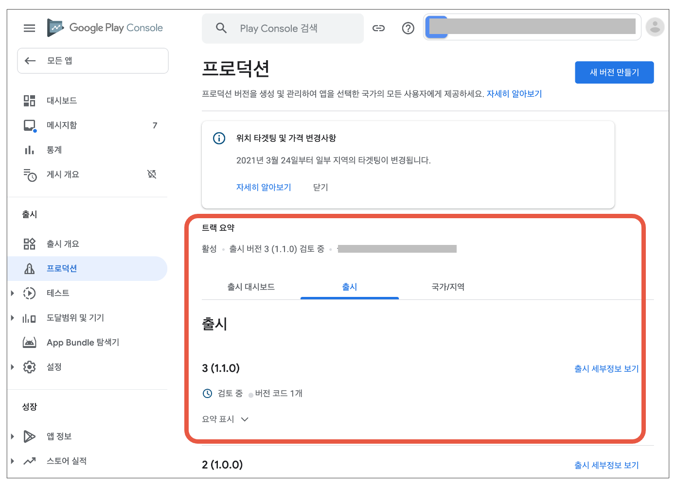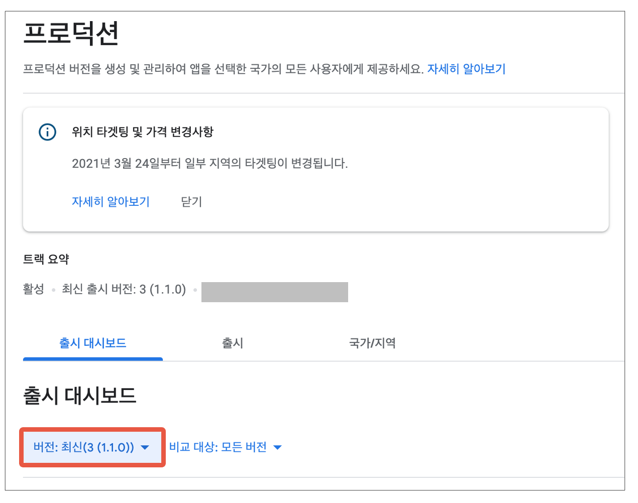 프로덕션 > 출시 대시보드에서도 방금 업로드한 최신 버전의 앱이 표기된다.