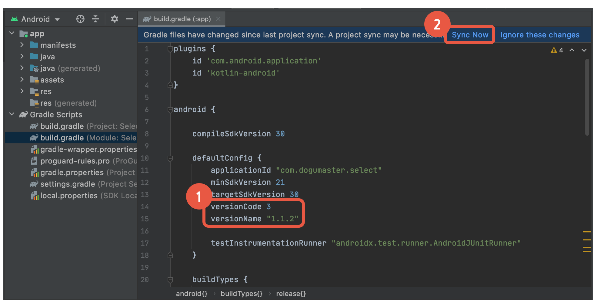 안드로이드 스튜디오 상에서, 앱의 버전을 업데이트하여 빌드하는 방법을 정리한다.