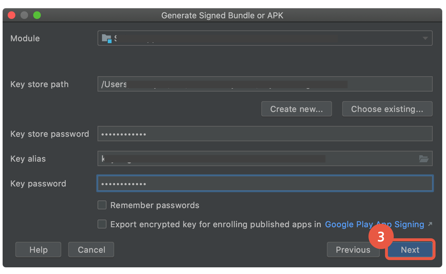3) Key Store와 key 의 비밀번호를 입력후, NEXT를 클릭한다