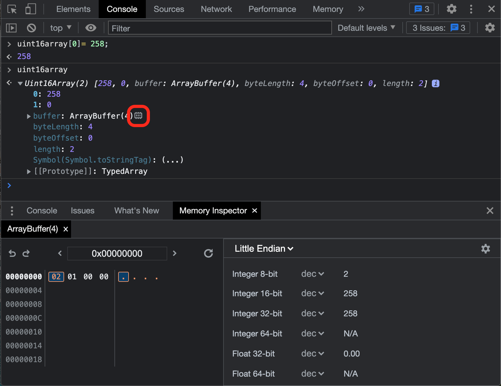 console.log(uint16array[0]); // [258, 0];