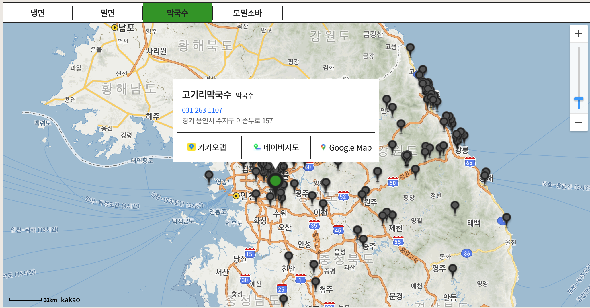 지도로 한눈에 막국수 맛집의 위치를 확인할 수 있습니다.