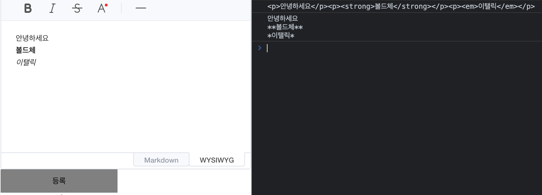 - button 클릭시, html 형식이나 markdown 형식으로 작성내용을 콘솔에 찍는다.