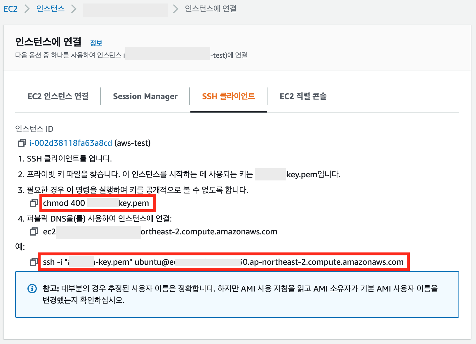 * EC2 > 인스턴스 경로에서, 인스턴스 선택한 다음 "연결"을 클릭 후,