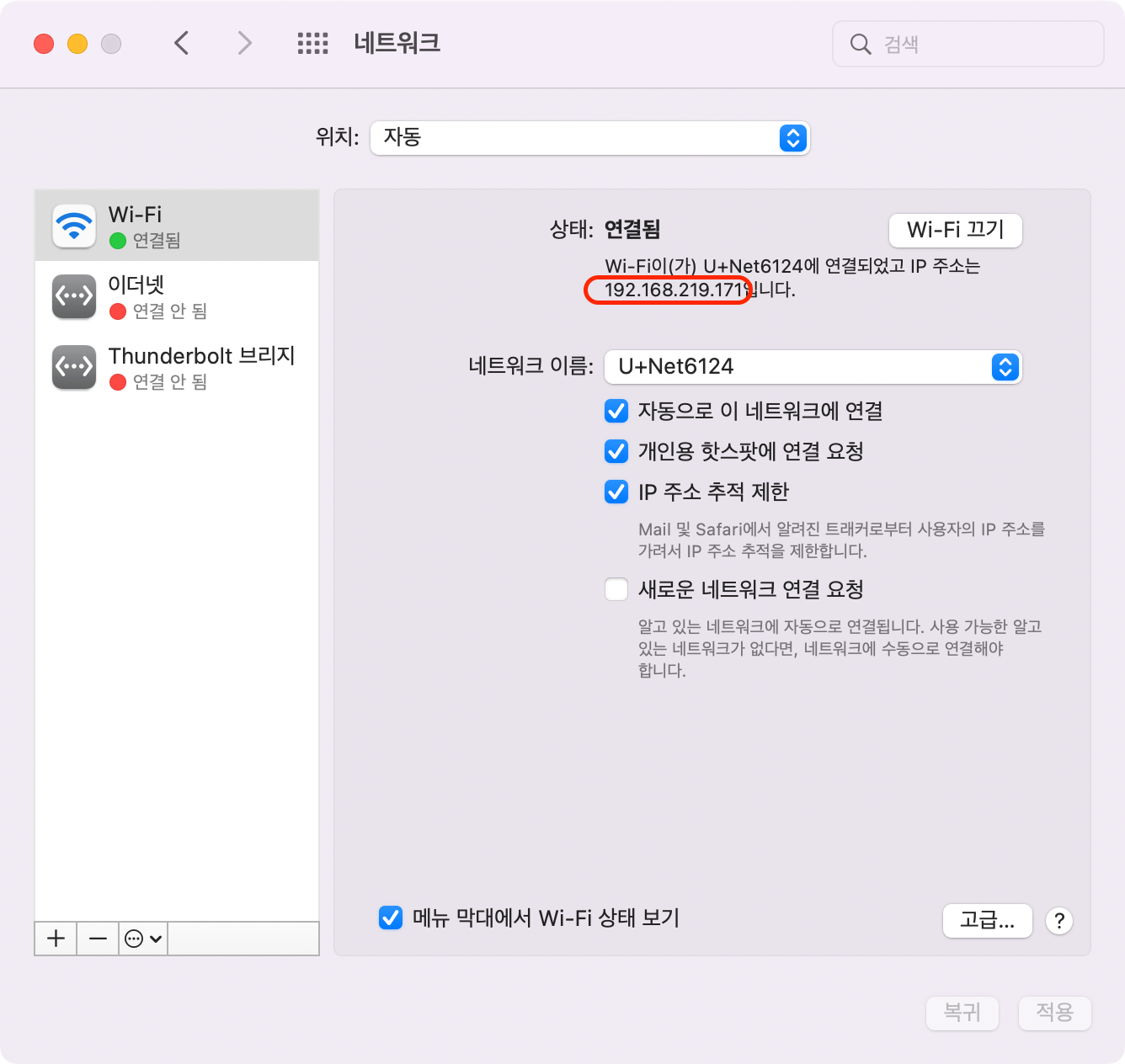 맥북을 기준으로 아래와 같이 내 컴퓨터의 ip주소를 확인할 수 있다.