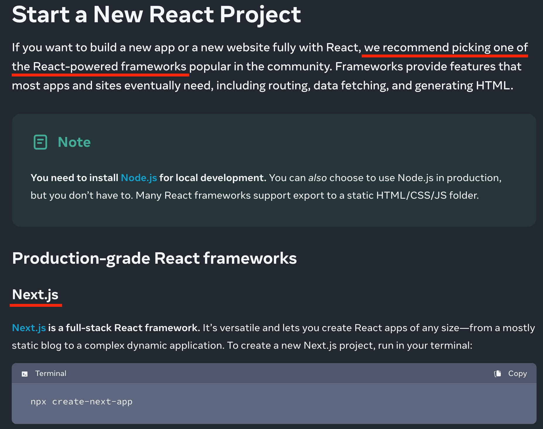 React 공식문서에서도 Next.js 를 이용해 React를 사용할 것을 권고하고 있다.